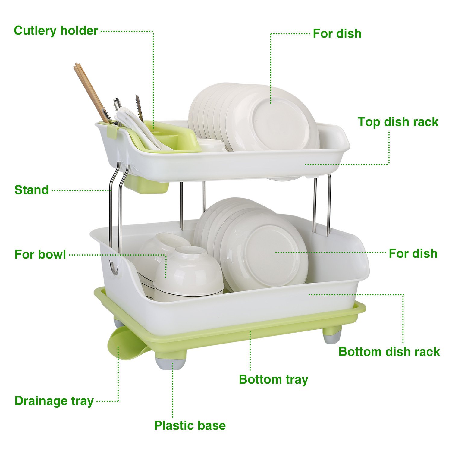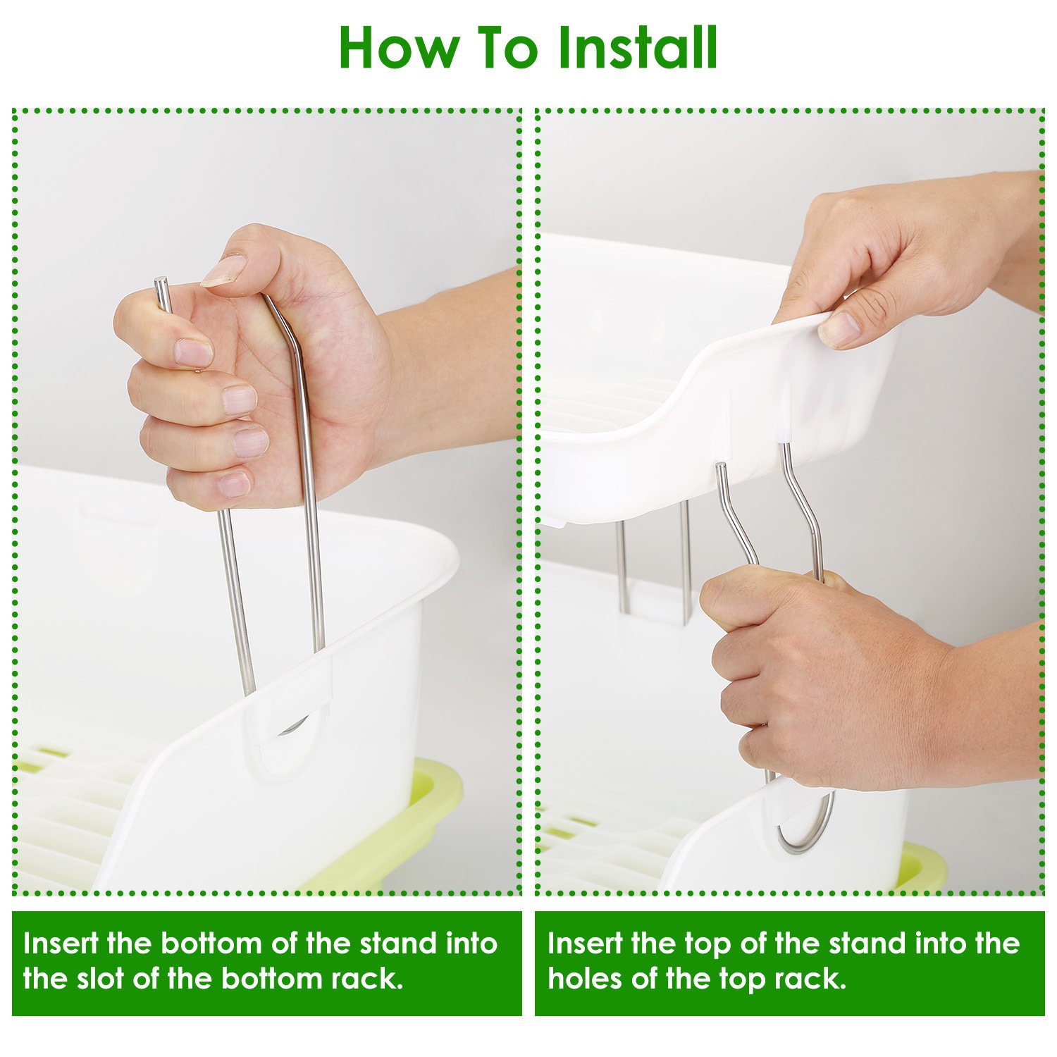 *Easy To Install*:Insert the end of the stands into the slot of the bottom rack and the top of them into the holes of the top rack. Then install the drainage tray at the bottom with the screw and put the cutlery holder on the top. No other tools are required.