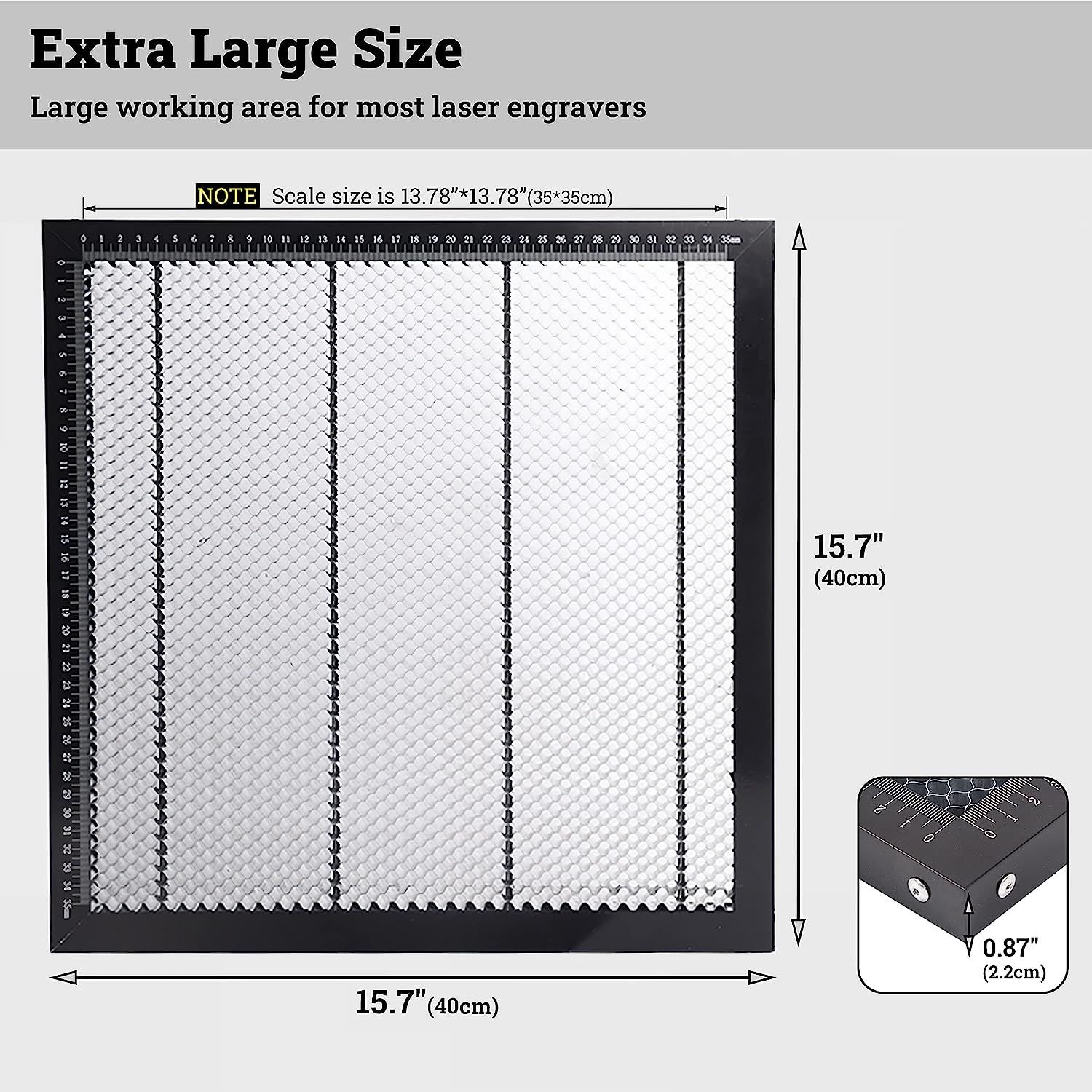 1.Product Size: The size of the laser honeycomb working table is 19.68 x 19.68 x 0.87 inches (500 x 500 x 22 mm). It is suitable for most popular laser engraving machines to maximize the working area. The edges of the honeycomb panels have precise scales, allowing the wood and metal laser engraving machines to easily measure objects.