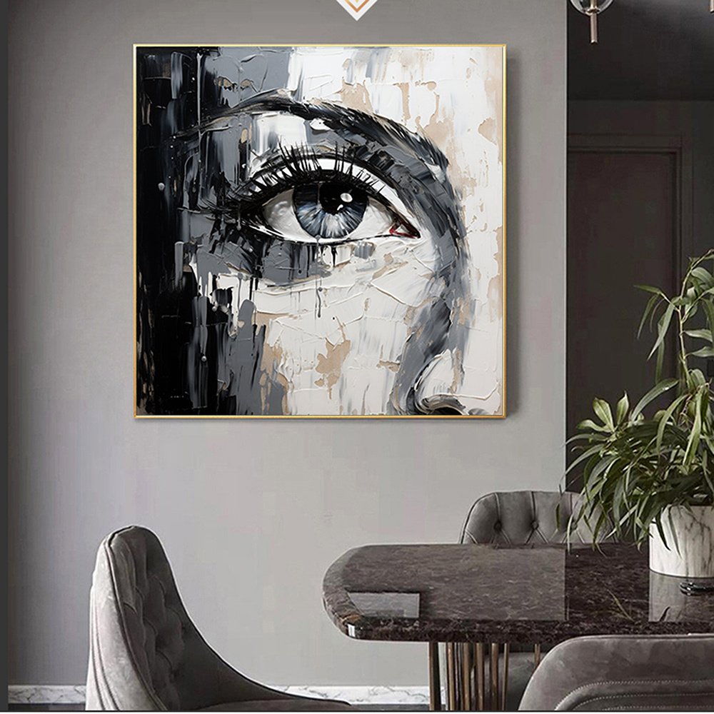 Hand Painted Oil Painting Palette Knife Eye painting Extra abstract wall art Black and white gold wall art face painting Bedroom Living room painting