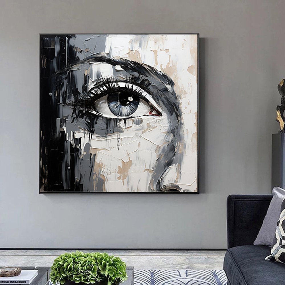 Hand Painted Oil Painting Palette Knife Eye painting Extra abstract wall art Black and white gold wall art face painting Bedroom Living room painting
