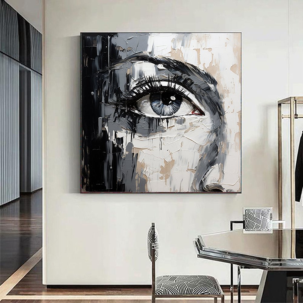 Hand Painted Oil Painting Palette Knife Eye painting Extra abstract wall art Black and white gold wall art face painting Bedroom Living room painting